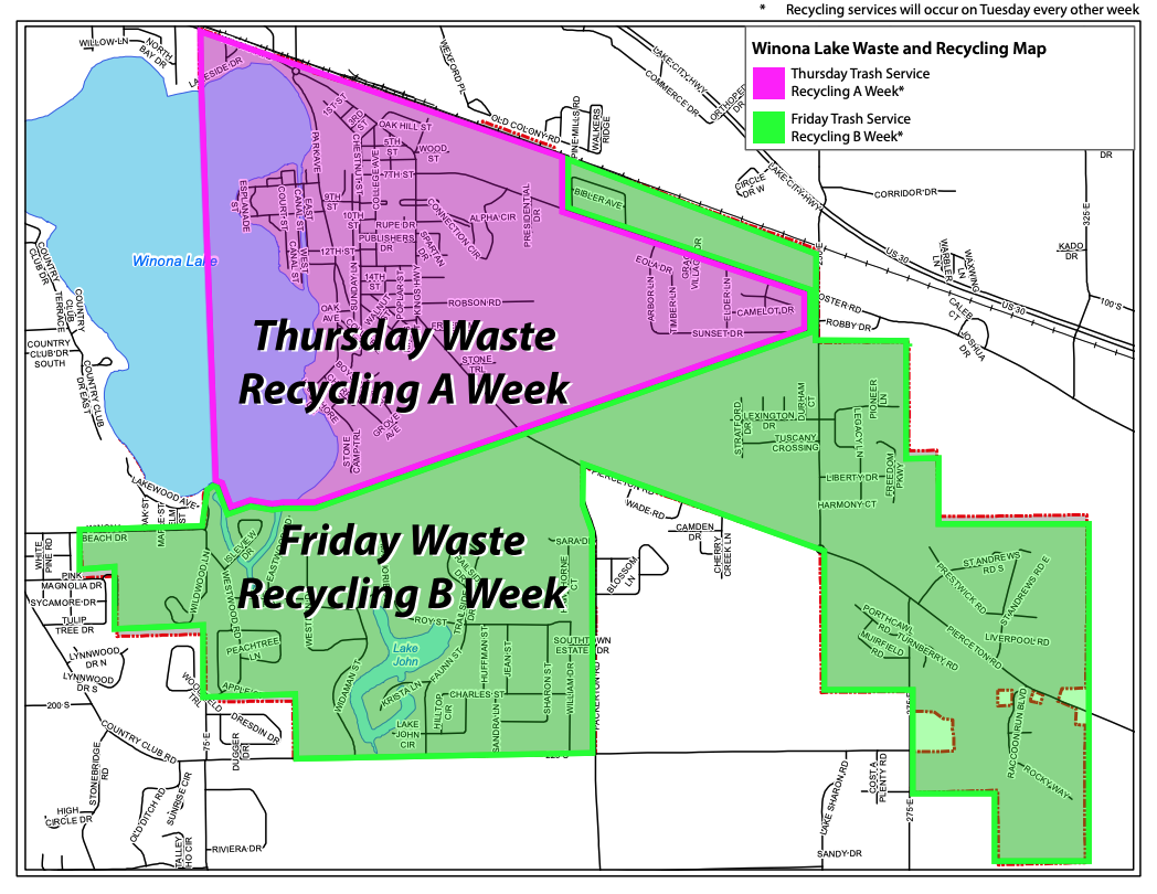 Trash is collected on Thursdays or Fridays depending on your location, while recycling is picked up every other Tuesday according to Schedule A or B, based on the same service map.